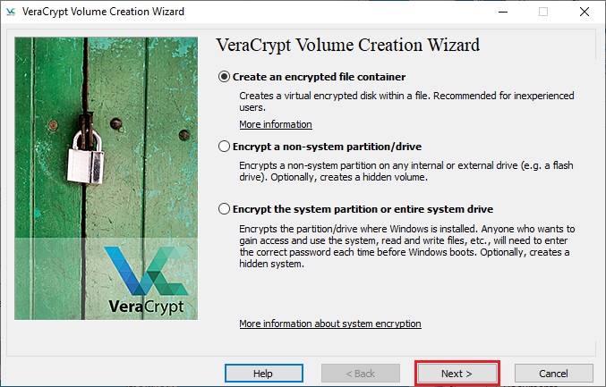 In this step you need to choose where you wish the VeraCrypt volume to be created. A VeraCrypt volume can reside in a file, which is also called container, in a partition or drive. In this tutorial, we will choose the first option and create a VeraCrypt volume