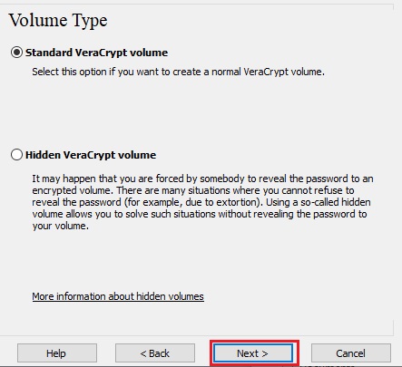 In this step you need to choose whether to create a standard or hidden VeraCrypt volume. In this tutorial, we will choose the former option and create a standard VeraCrypt volume.