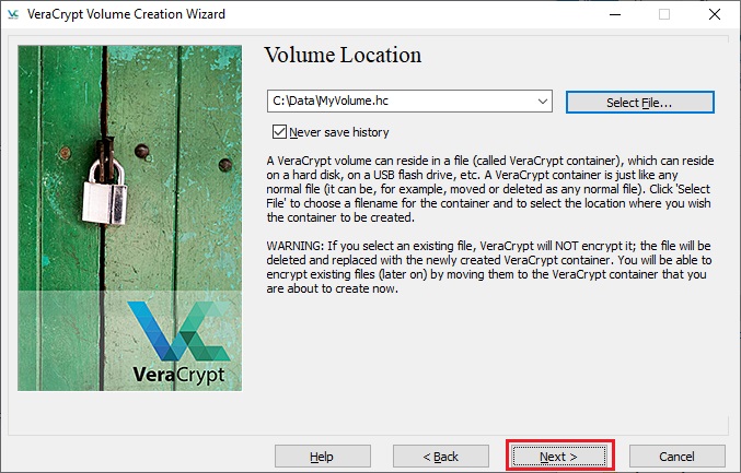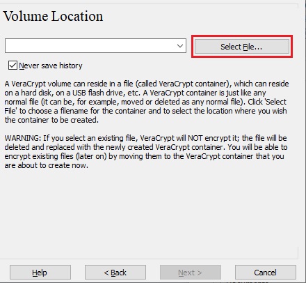 IMPORTANT: Note that VeraCrypt will not encrypt any existing files (when creating a VeraCrypt file container). If you select an existing file in this step, it will be overwritten and replaced by the newly created volume (so the overwritten file will be lost, not encrypted). You will be able to encrypt existing files (later on) by moving them to the VeraCrypt volume that we are creating now.*