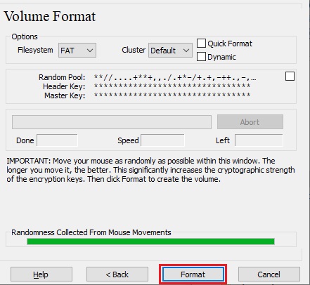 Move your mouse as randomly as possible within the Volume Creation Wizard window at least until the randomness indicator becomes green. The longer you move the mouse, the better (moving the mouse for at least 30 seconds is recommended). This significantly increases