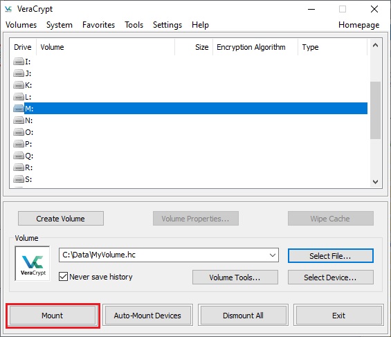 In the remaining steps, we will mount the volume we just created. We will return to the main VeraCrypt window (which should still be open, but if it is not, repeat Step 1 to launch VeraCrypt and then continue from Step 13.)
