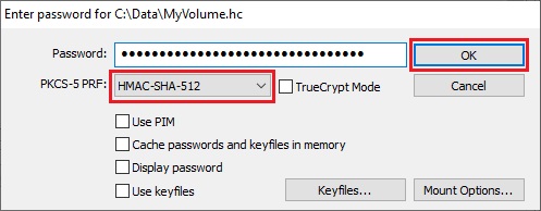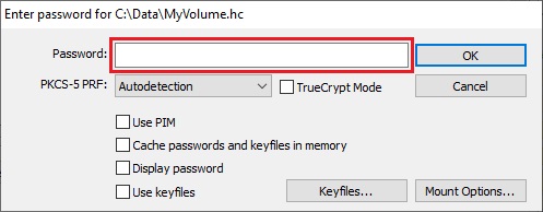 In the main VeraCrypt window, click Mount. Password prompt dialog window should appear.